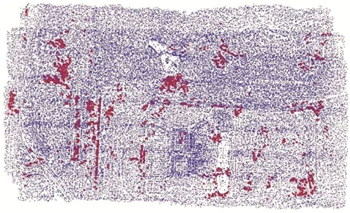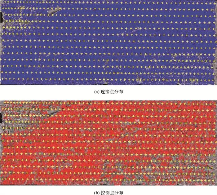 图 7 无人机影像测区自动提取的连接点(蓝色)和控制点(红色)Fig. 7 Tie points (blue) and control points (red) of UAV images block
