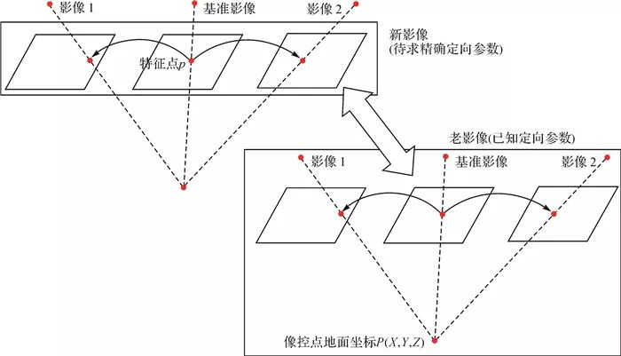 值得注意的是,新影像与老影像既可以是同源影像(相同类型传感器拍摄的影像,如两者都是框幅式航空影像),也可以是异源的(如框幅式航空影像与线阵扫描式航空影像)。以下简单介绍一个基于已知定向参数的异源影像控制的试验实例。