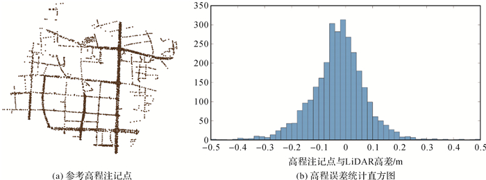 图 10为高程精度评定情况,图(a)为DLG中的高程注记点,其精度约为2~3 cm,共3030个,图(b)为高程注记点与LiDAR点云之间高程差值的分布直方图,由图 10可知LiDAR点云高程误差呈正态分布。采用图(a)的高程注记点评定的LiDAR的高程中误差为7.8 cm。