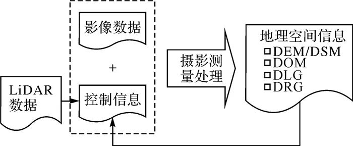摄影测量与遥感的实质是从影像中提取被摄对象的几何与辐射信息,国际摄影测量与遥感学会(ISPRS)从2000年在阿姆斯特丹举行的第十九次代表大会开始,便将“information from imagery”作为其标语[10],其中遥感关注于提取辐射信息,而摄影测量关注于提取几何信息。摄影测量的处理过程便是在控制信息的约束下,将原始的影像数据加工为DOM、DEM、DLG和数字表面模型(DSM)等地理空间信息产品。