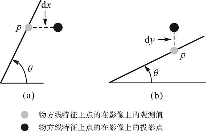 摄影测量起源于测量学中“测点”的前方交会和后方交会,所涉及的点都是影像上可以明显判别的点(明显点),为了将大量线特征(如道路线、建筑物边缘线等)作为控制信息进行影像几何定位,必须将点扩展到线。传统的点可以列x、y两个误差方程式,而广义点(线)则根据影像线特征角度的大小选择性地列出一个误差方程式。如图 8所示,设p点所在特征线与水平方向夹角为θ,当-45° < θ≤45°或当135° < θ≤225°时(见图 8(a)),特征点在x方向残差(特征点在影像上观测坐标与对应物方点在影像上投影坐标之差)较小,可列像点观测值x的方程;否则,则列像点观测值y的方程,参与摄影测量处理的平差计算。直观地理解特征线上一个点就相当于“半个”特征点,其他没有差别。基于线的“云控制”与基于点“云控制”完全兼容,因此“广义点”非常灵活、非常方便。