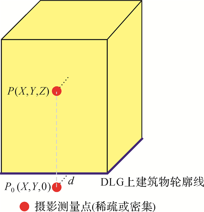 在具有DLG的情况下,LiDAR点云可与DLG组合成多元联合控制。可在LiDAR点云控制的基础上,利用DLG进一步加强平面控制。对于城市场景,DLG的控制作用主要来自建筑物的轮廓矢量线,如图 14所示,黄色立方体表示建筑物,其底部的蓝线为DLG中建筑物的轮廓矢量线,对于墙面上的摄影测量点P,通过最小化其在水平面上投影点P0到蓝线的距离d,可实现影像墙面点与DLG建筑物轮廓线平面位置的重合,进而实现DLG对影像的平面控制。