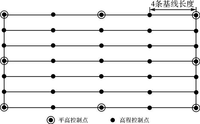 传统摄影测量的控制信息为外业采集的控制点,这些点一般位于地面上明显标志点,如圆点、交点和角点等,在此称之为“点控制”摄影测量。为保证空三加密和立体测图的精度,“点控制”摄影测量的控制点分布需要遵守严格的作业规范,如图 1所示,一般要求测区周边布设平高控制点,测区内部按一定倍数的基线长度布设多排高程控制点。对于传统量测型相机而言,由于影像像幅大,测区影像数量少,需要控制点的数量有限;然而,现阶段广泛使用的无人机影像,其像幅小、几何畸变大和质量不佳等特点,决定了其空三加密需要大量的控制点。尽管GNSS技术降低了外业控制点采集的难度,然而,测量外业控制点仍然十分困难与耗时,造成测量外业控制点的时间远超过影像获取的时间。显然,外业控制点量测仍然是制约航测空三加密效率的关键因素,导致“点控制”摄影测量已难以适应大数据时代影像数据的特点和其对处理效率和高度自动化的要求。