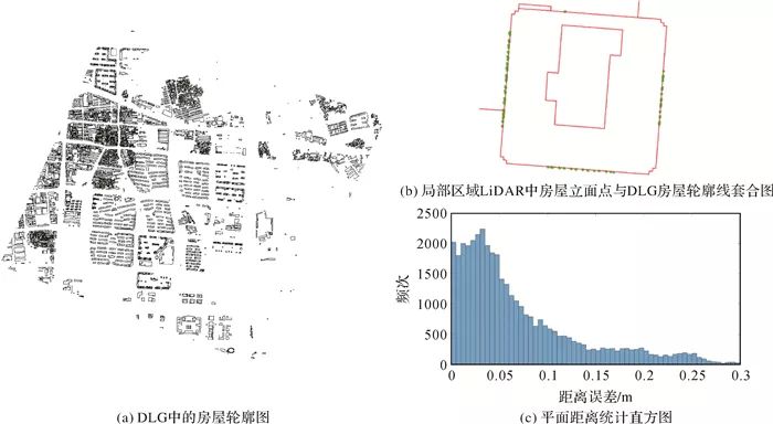图 11为平面精度评定情况,图(a)为DLG中的房屋轮廓线,其平面精度优于5 cm,图(b)为局部区域从LiDAR点云中提取的房屋立面点与DLG中房屋轮廓线的套合图,图(c)为房屋立面点到DLG房屋轮廓线的垂直距离的统计直方图。平面精度评定共使用38 299个房屋立面点,评定的LiDAR点云平面中误差为6.9 cm(略优于高程精度)。