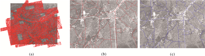图 9所示为利用基于道路中心线检测的影像与矢量自动配准方法进行SPOT 5影像与矢量地图配准的试验,其中图(a)为影像与矢量(红线)的整体套合图,图(b)为局部区域影像与矢量(红线)的套合情况,图(c)为自动配准后影像与矢量(蓝线)的套合情况。试验区共匹配了7062条矢量线,检测了77 953个道路中心点作为SPOT 5影像定向的控制点,采用广义点摄影测量理论进行定向的像点中误差为1.45像素。从图 9中可以看出,自动配准后影像与矢量的套合一致性较好,有效地实现了基于矢量地图的影像几何定位。
