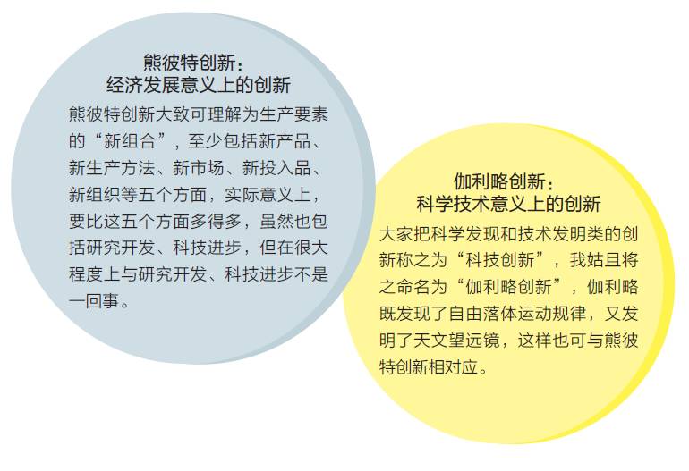 “创新”的概念很宽泛。我们谈论的创新,首先是经济发展意义上的创新,也就是熊彼特在《经济发展理论》里所说的创新。但是有时候,说的又好像是科学发现和技术发明意义上的创新,伽利略有句名言“科学真理需要在实验和基于实验的理论中去寻找”,这里说的就是知识和真理的探寻。大家把科学发现和技术发明类的创新称之为“科技创新”,我姑且将之命名为“伽利略创新”,伽利略既发现了自由落体运动规律,又发明了天文望远镜,这样也可与熊彼特创新相对应。