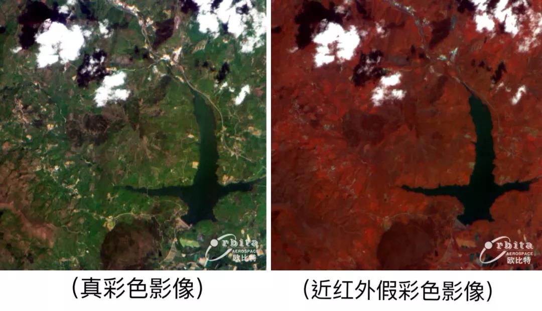 从上面的对比影像可以看出,植被区域趋于红色,而水体颜色比较暗,主要原因是植被在近红外波段反射率较高,水体在近红外波段反射率较低,这种光谱特性有利于地物识别分析。