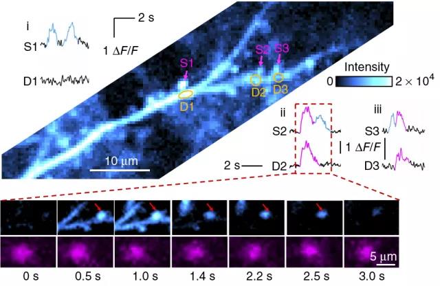 北京大学生物膜与膜生物工程国家重点实验室程和平及陈良怡研究组与电子工程与计算机科学学院张云峰和王爱民等合作,运用微集成、微光学、超快光纤激光和半导体光电子学等技术,在高时空分辨在体成像系统研制方面取得突破性技术革新,成功研制出2.2克微型化佩戴式双光子荧光显微镜,在国际上首次记录了悬尾、跳台、社交等自然行为条件下,小鼠大脑神经元和神经突触活动的高速高分辨图像。此项突破性技术将开拓新的研究范式,在动物自然行为条件下,实现对神经突触、神经元、神经网络、多脑区等多尺度、多层次动态信息处理的长时程观察,这样不仅可以“看得见”大脑学习、记忆、决策、思维的过程,还将为可视化研究自闭症、阿尔茨海默病、癫痫等脑疾病的神经机制发挥重要作用。相关研究进展发表在2017年7月《自然·方法学》[Nature Methods, 14(7):713—719]上。该成像系统被2014年诺贝尔生理学或医学奖得主Edvard I. Moser称之为研究大脑的空间定位神经系统的革命性新工具。