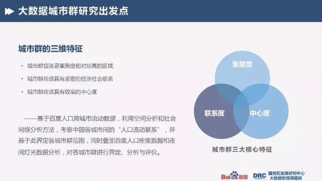 基于国务院发展研究中心大数据宏观团队研究方法的创新以及百度地图时空大数据的优势,报告界定了城市群的三维特征: