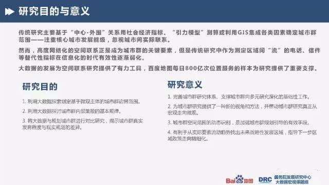 报告利用由微观个体用户的行为产生的大数据,尝试划定城市群边界范围,探索内部集散基本规律,为城市群研究从宏观走向微观提供了新的视角和方法。百度地图每天响应超过800亿次位置服务,能够提供宝贵的真实人口流动数据,有效弥补宏观统计数据的不足,为研究城市群提供重要数据支撑和新的研究工具。