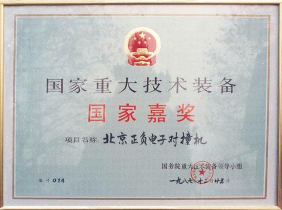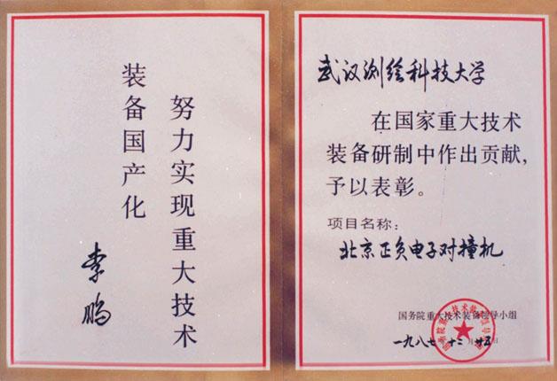 奖项名称:1987年获“国家重大技术装备国家嘉奖”和李鹏总理签发的荣誉证书。