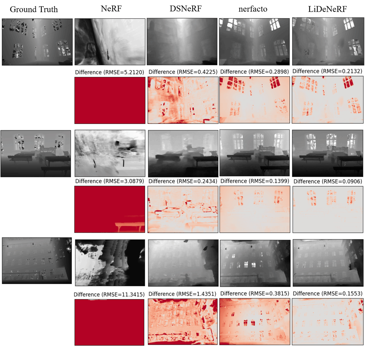 图2 LiDeNeRF 深度估计部分对比实验结果(具有最小的Depth RMSE)
