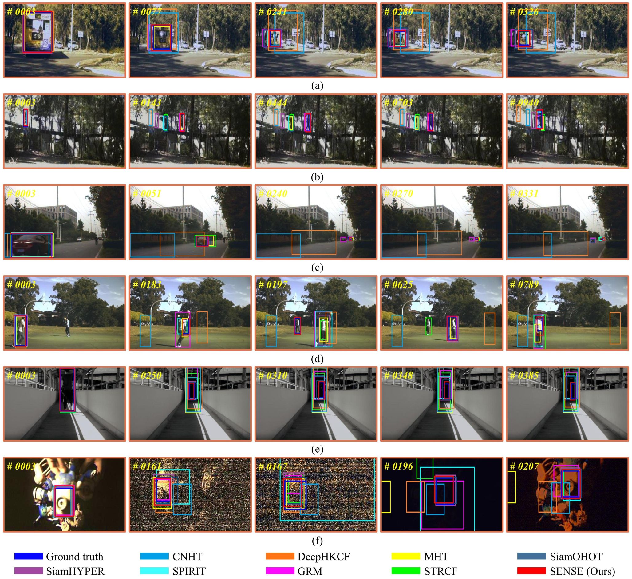 研究团队提出了一种融合材质属性与运动线索的高光谱视频目标跟踪模型(图1)。该模型自适应地将高光谱图像划分为互补的模态,聚合并增强多模态差异与共性特征。此外,运动感知模块可自适应判断材料与运动线索的可靠性,并在材料线索不可靠时预测目标的位置和尺度,提升了跟踪的稳健性。图2呈现了不同跟踪方法的目视比较。