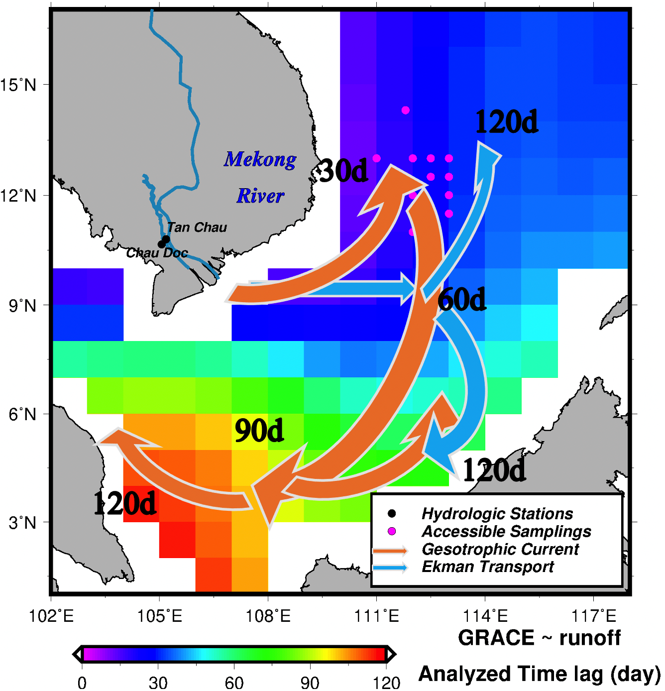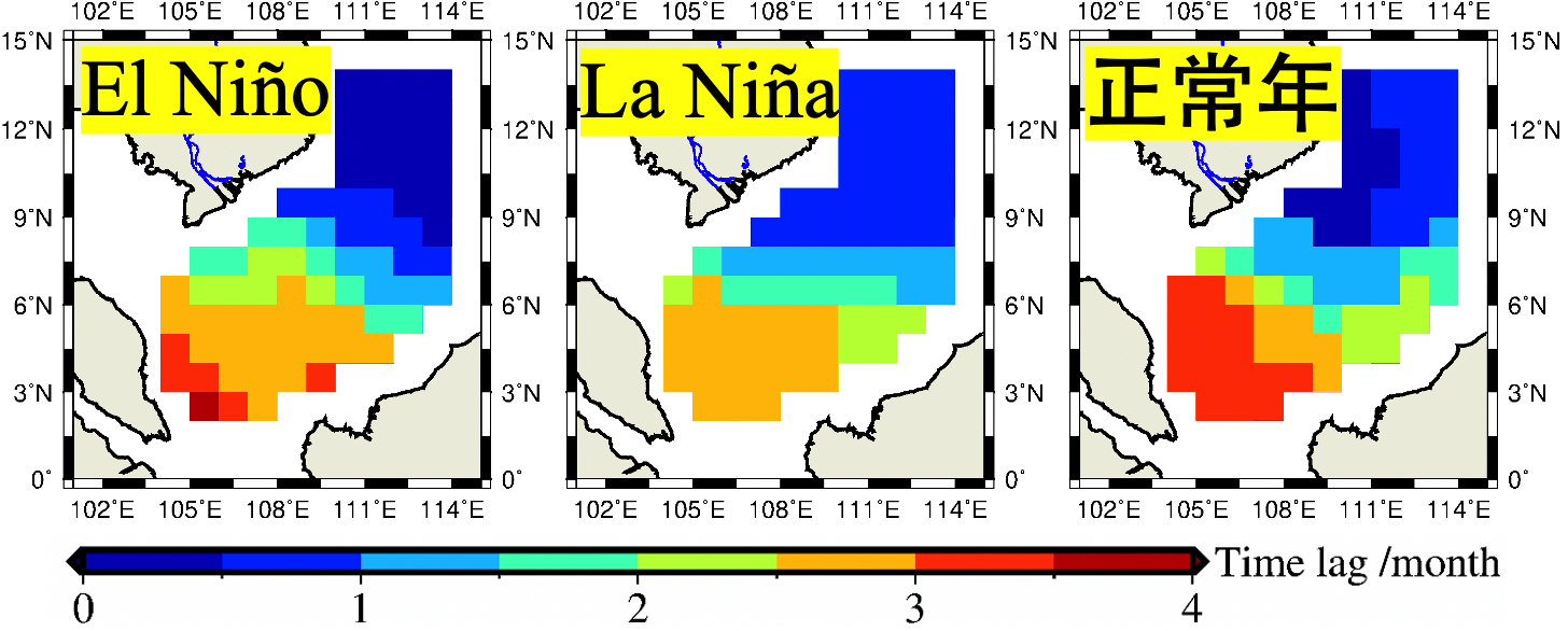 本研究全球首次提出了基于时变重力卫星(GRACE)连续观测远洋河口冲淡水的大地测量方法,计算湄公河河口冲淡水在南海的传播时延,推断其远场传播模式,并与实测同位素淡水年龄进行有效验证。研究发现湄公河河口冲淡水在远场呈现先东北后西南的顺时针传播模式,并结合数值模拟揭示了其以地转流作主导、风生洋流作调控转向的驱动机制。同时对ENSO异常事件期间冲淡水远场传播的加速和减速现象进行量化,发现其影响比例不超过正常水平的5%。