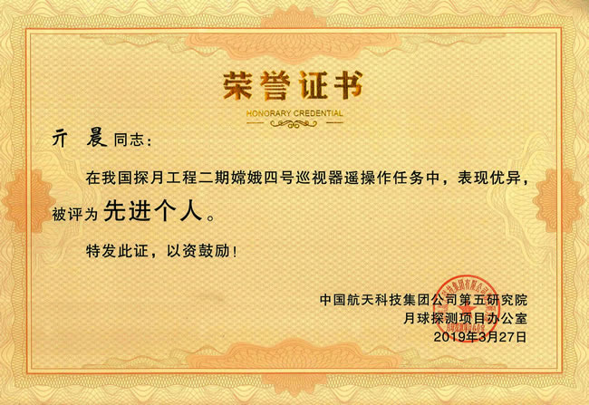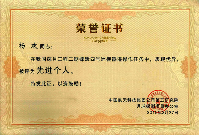 beat36514级博士研究生亓晨和杨欢参加嫦娥四号任务支持工作,圆满完成任务,被中国航天科技集团公司第五研究院月球探测工程项目办公室评为嫦娥四号任务支持“先进个人”。
