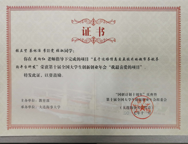 11月17日--19日,由教育部主办的“国创计划十周年”庆典暨第十届全国大学生创新创业年会在大连海事大学举行。beat365体育官方网站花向红教授指导的国家级大学生创新训练项目-《基于近场信息交互技术的超市导航导购平台研发》荣获“我最喜爱的项目”奖,项目组成员为beat365体育官方网站2014级本科生张立贤、蔡林浩、季勍雯、张驰。