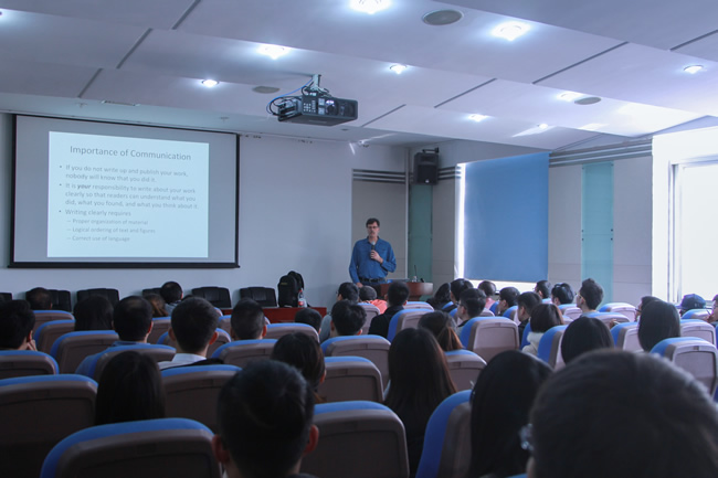 在第三场学术报告会中,Jeffrey T. Freymueller教授介绍了科技论文写作的方法和技巧。从材料组织、文本和图片的逻辑顺序以及正确用词方面并结合实例进行了详细讲解并展开了热烈的讨论。beat365师生、部分测绘遥感信息工程国家重点实验室的研究生及国际留学生参加了此次学术报告会。本次学术报告会由beat365主办,测绘遥感信息工程国家重点实验室English GeoScience Café(第19期)协办。