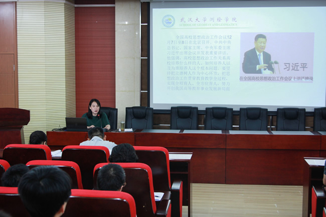 接着孙萍书记传达中央巡视组反馈意见以及武汉大学党委全委会部署和动员中央巡视整改工作会议精神。孙萍书记带领全体党员集体学习习近平总书记关于发挥巡视利剑作用重要论述。她结合学院党建工作实际,要求各支部要抓好“三会一课”落实,把“两学一做”学习教育深入持久常态化制度化开展下去。