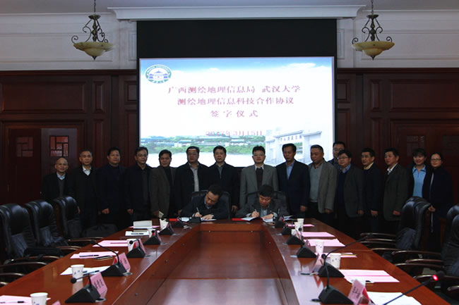 广西测绘地理信息局党组成员、总工程师周涛和武汉大学科学技术发展研究院院长李平湘代表双方签署协议。