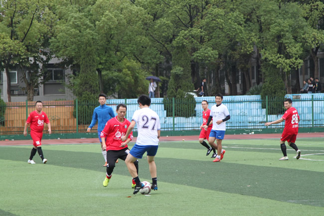 上午十点,校友队与教职工队的比赛正式开始,阵阵小雨并未阻挡大家的热情,双方摩拳擦掌,跃跃欲试。beat365院长姚宜斌、党委书记孙萍、副院长史振华、副书记王中全等老师也亲临现场,为双方队员加油助阵。上半场阶段,教职工代表队密切配合,灵活穿插,凭借行云流水的突破率先攻入两球,取得领先优势。而校友代表队沉着应对,在比赛下半场积极调整战术,主打边线逐渐掌握赛场节奏。随着终场哨声的临近,校友代表队一鼓作气,两次单刀逼平比分,随后又在禁区内的混战中再下一城,最终3:2逆转,锁定胜局。