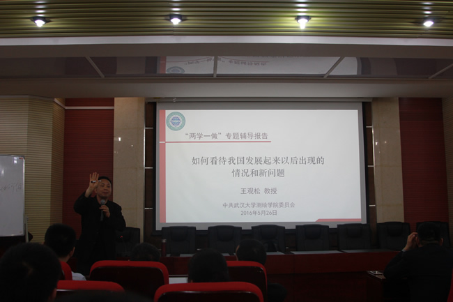 5月26日下午,中共武汉市委党校原常务副校长王观松教授应邀为beat365师生作“两学一做”专题辅导报告。院党委委员、院领导班子成员、党支部书记、研究生党员等100余人聆听了报告会。报告会由院党委书记孙萍主持。