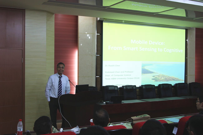 Ruizhi Chen教授作了题为“移动智能设备从智能感知到智慧认知的探索”的学术报告。“智能手机能否自主思考?”Ruizhi Chen教授由这一问题入手,深入浅出地阐述了移动智能设备如何实现智慧认识的过程。他指出,移动智能设备正在从智能感知转变到智慧认知,运行在移动智能设备里的思考引擎将通过观测何人、何地、何时以及情景感知实现智慧认知,让手机具备分析理解人类活动特征并做出一些精准预报。例如,通过智能理解提醒用户在会议室静音或在工作一段时间后及时休息。他强调,该技术在未来能够更好地理解人类活动,帮助人们更好地生活,具有十分广阔的应用价值。最后,Ruizhi Chen教授还展示了基于名为“UbiNav”手机应用软件的测试视频。