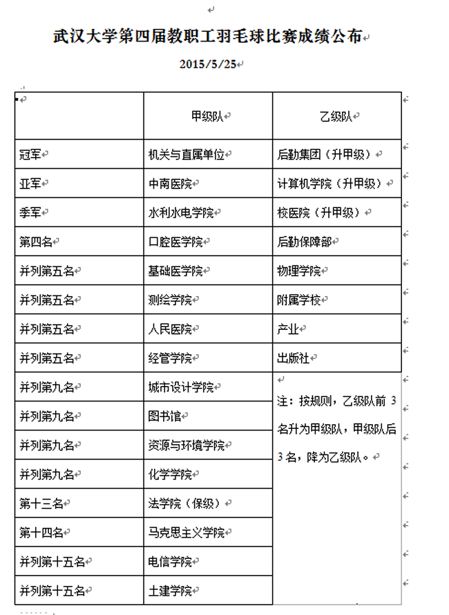 次比赛采取甲/乙级赛制,全校共有39个二级工会组队参赛。其中,甲级组16支队伍分四个小组循环比赛,乙级组22支队伍(含1个联队)分6个小组循环比赛。根据比赛规则,甲级组每组前二名才能成功进入八强,后二名必须经过1—2场附加赛决定保甲队伍和产生3支降至乙级的队伍。所有比赛均采取五局三胜制,即1个混双、2个男双、1个女双和1个男单。