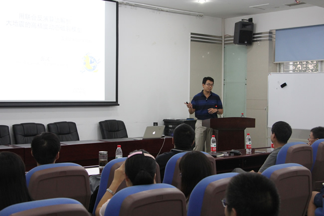 岳汉博士作了题为“Toward resolving stable high-resolution kinematic rupture models of large earthquakes by joint inversion of seismic, geodetic and tsunami observations”的报告。岳汉博士以“陆海空”三军联合作战的生动形象比喻,介绍了当今国际地学领域联合地表GPS形变观测、海啸波高、地震波和海底GPS等多源数据的有限断层模型联合反演研究,通过其在JGR、GRL和Nature等期刊发表的大量高水平成果向师生们展示了他在多源数据联合反演方面系统扎实和卓有成效的工作。