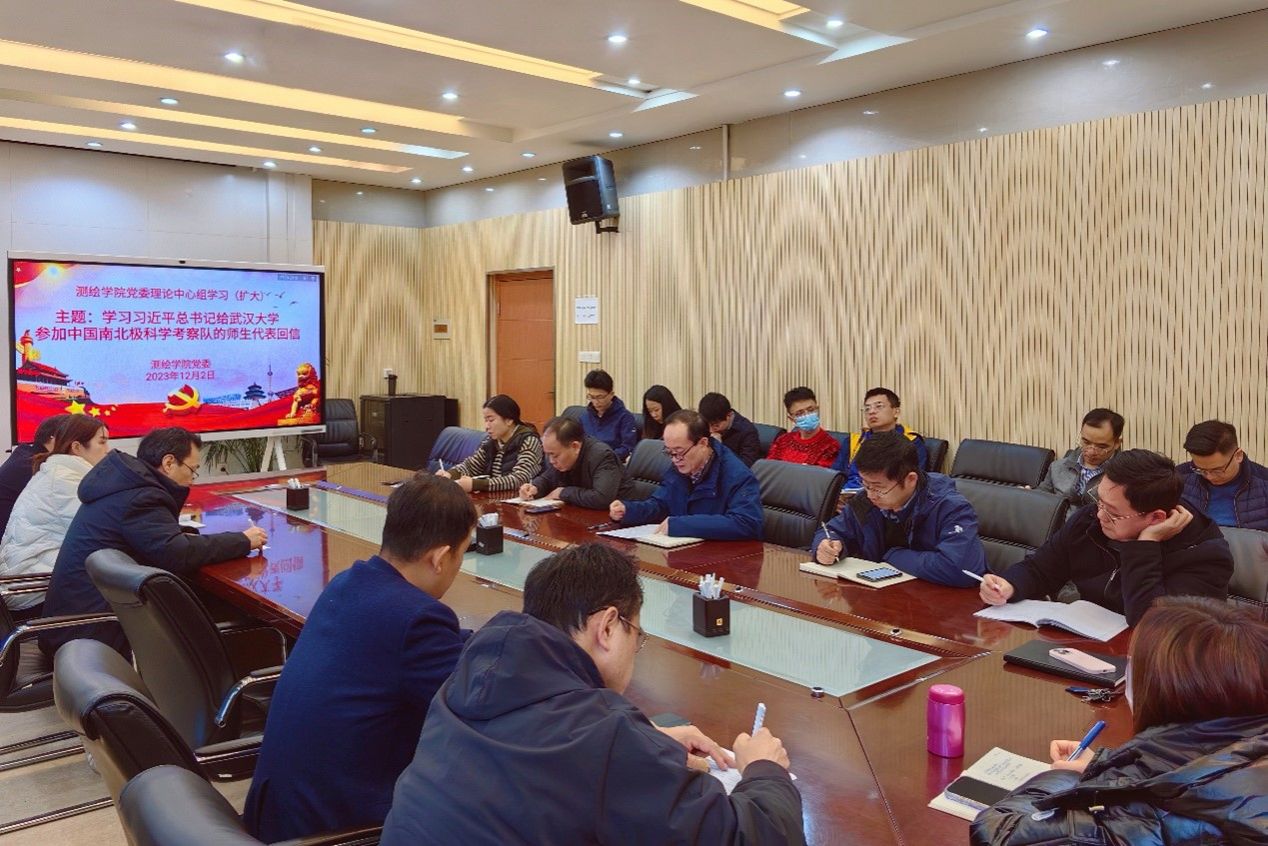 12月2日下午,beat365党委理论学习中心组(扩大)集体学习会举行,专题学习习近平总书记给武汉大学参加中国南北极科学考察队师生代表的重要回信精神。学院党委理论学习中心组成员、教职工党支部书记和学生辅导员参加学习。学院党委书记晏金柱主持集体学习会。