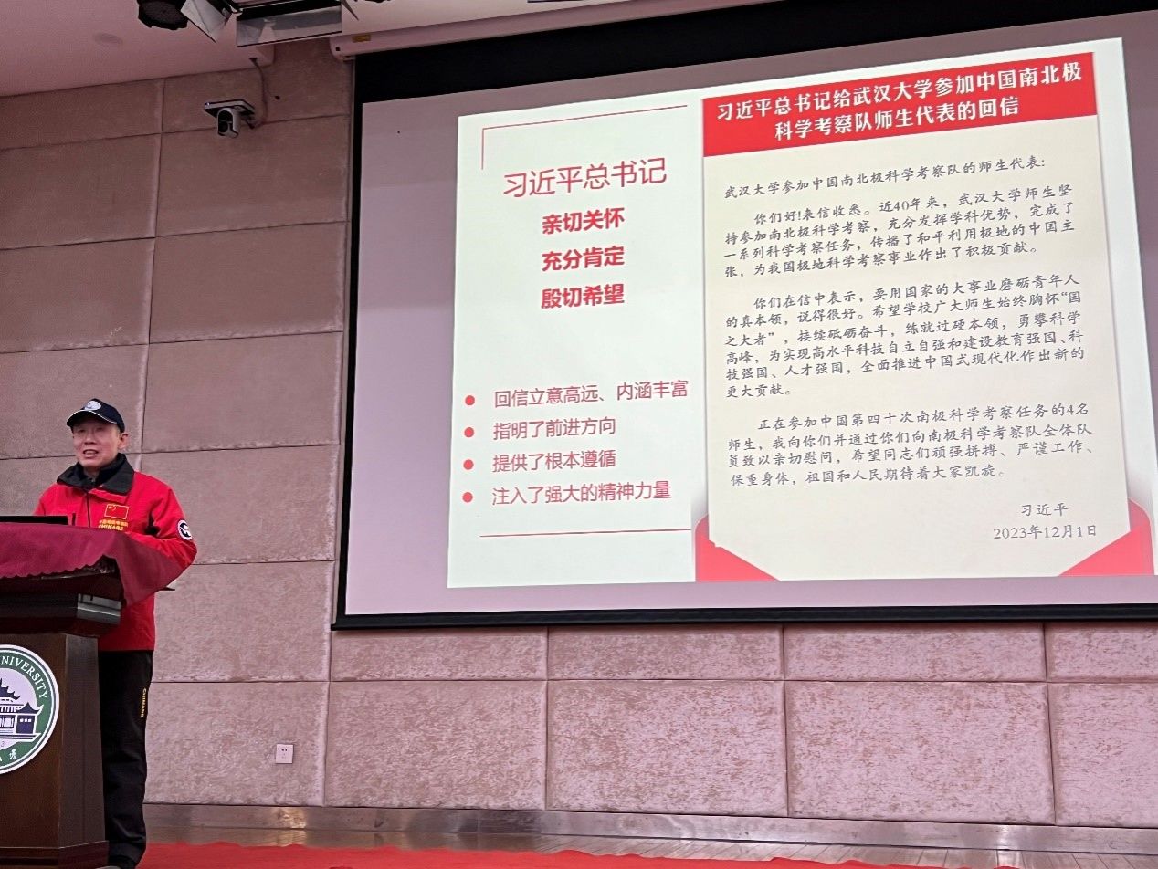 王泽民老师深情回顾武汉大学的极地科考历史,并带同学们重温习近平总书记给武汉大学参加中国南北极科学考察队师生代表的重要回信,启迪武大测绘学子为祖国的极地科考事业而努力。