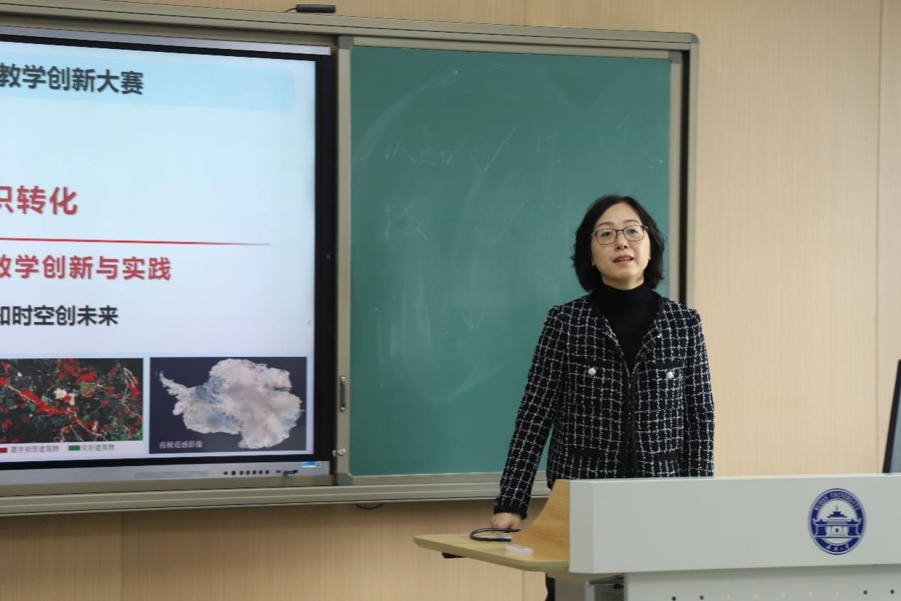刘汇慧老师以“项目驱动知识转化”为题汇报了《遥感原理与应用》教学创新与实践,将教师团队的课题项目引入课堂,充分利用线上线下混合式教学模式,引导学生根据所学理论知识对项目从需求端到知识端展开研讨、论证及实践,助力学生实现知识理解、运用、创造的三次进阶,深度挖掘专业知识中所蕴含的家国情怀、历史使命与时代责任。