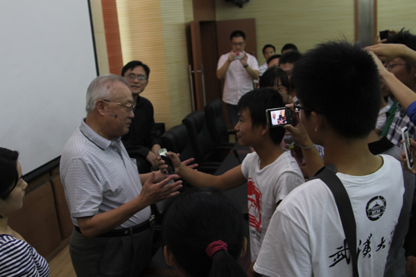 宁津生院士还兴致勃勃地从“武测”的创建、历史沿革、学科建设、科学研究、师资队伍和对外交流等方面娓娓道来。他如数家珍,学生们认真聆听,不知不觉中报告会已持续3个小时,同学们意犹未尽,纷纷走到宁津生院士身前进行零距离交流。