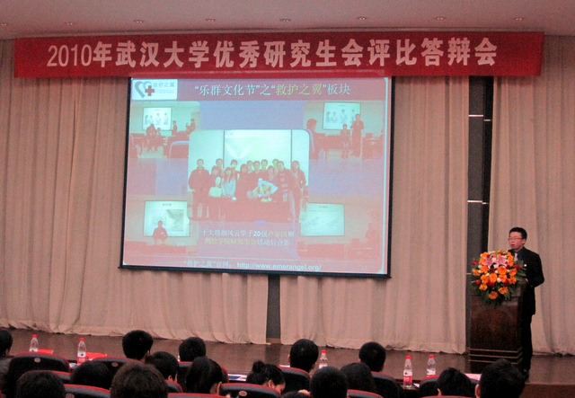 4月19日下午2点,于武汉大学教五多功能报告厅,一年一度的武汉大学“优秀研究生会”评比答辩大会在此拉开了帷幕。2010年武汉大学“优秀研究生会”评比结果已于近日在武汉大学未来网(www.future.org.cn)公示并通过,其中beat365研究生会以调研分全校第一,答辩分全校第五,总分全校第四、理工科院系第一的成绩夺得2010年武汉大学“优秀研究生会”称号,这也是beat365体育官方网站研会自成立以来首次获得武汉大学“优秀研究生会”称号。