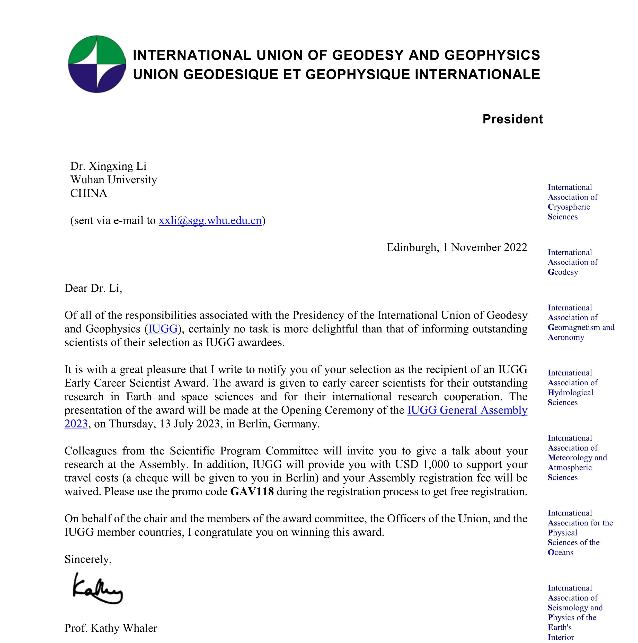 11月1日,国际大地测量和地球物理学联合会(International Union of Geodesy and Geophysics,IUGG)官方宣布,武汉大学李星星教授荣获IUGG青年科学家奖(Early Career Scientist Award)。