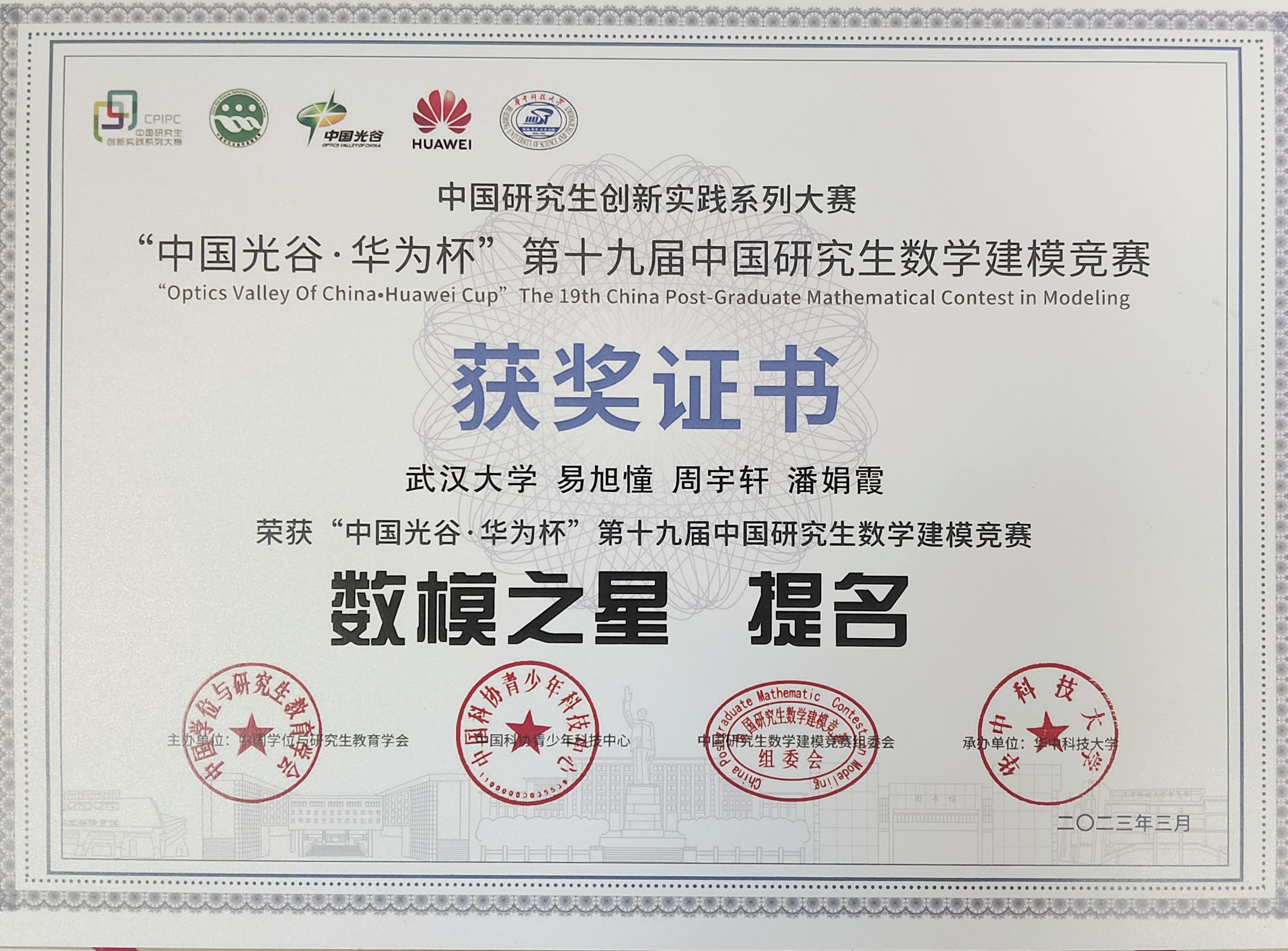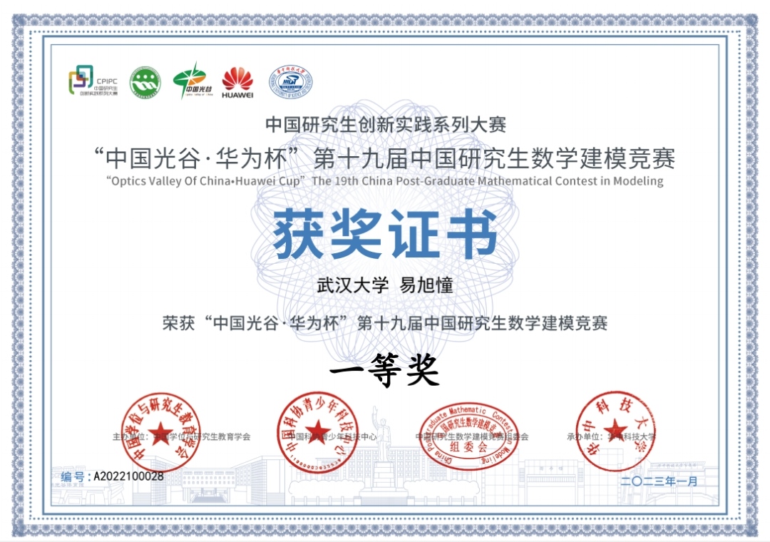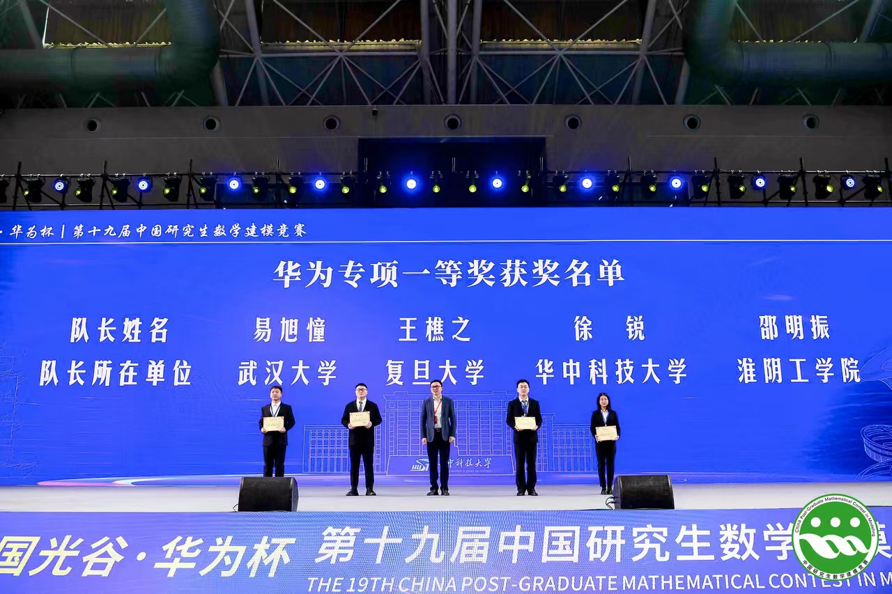 瞄准原始创新,聚焦基础研究。3月19日,“中国光谷·华为杯”第十九届中国研究生数学建模竞赛颁奖典礼在华中科技大学光谷体育馆举行。学院研究生易旭憧、周宇轩、潘娟霞从来自全国465个研究生培养单位超6万名参赛研究生中脱颖而出,获得“数模之星”提名奖、全国一等奖、华为专项一等奖。