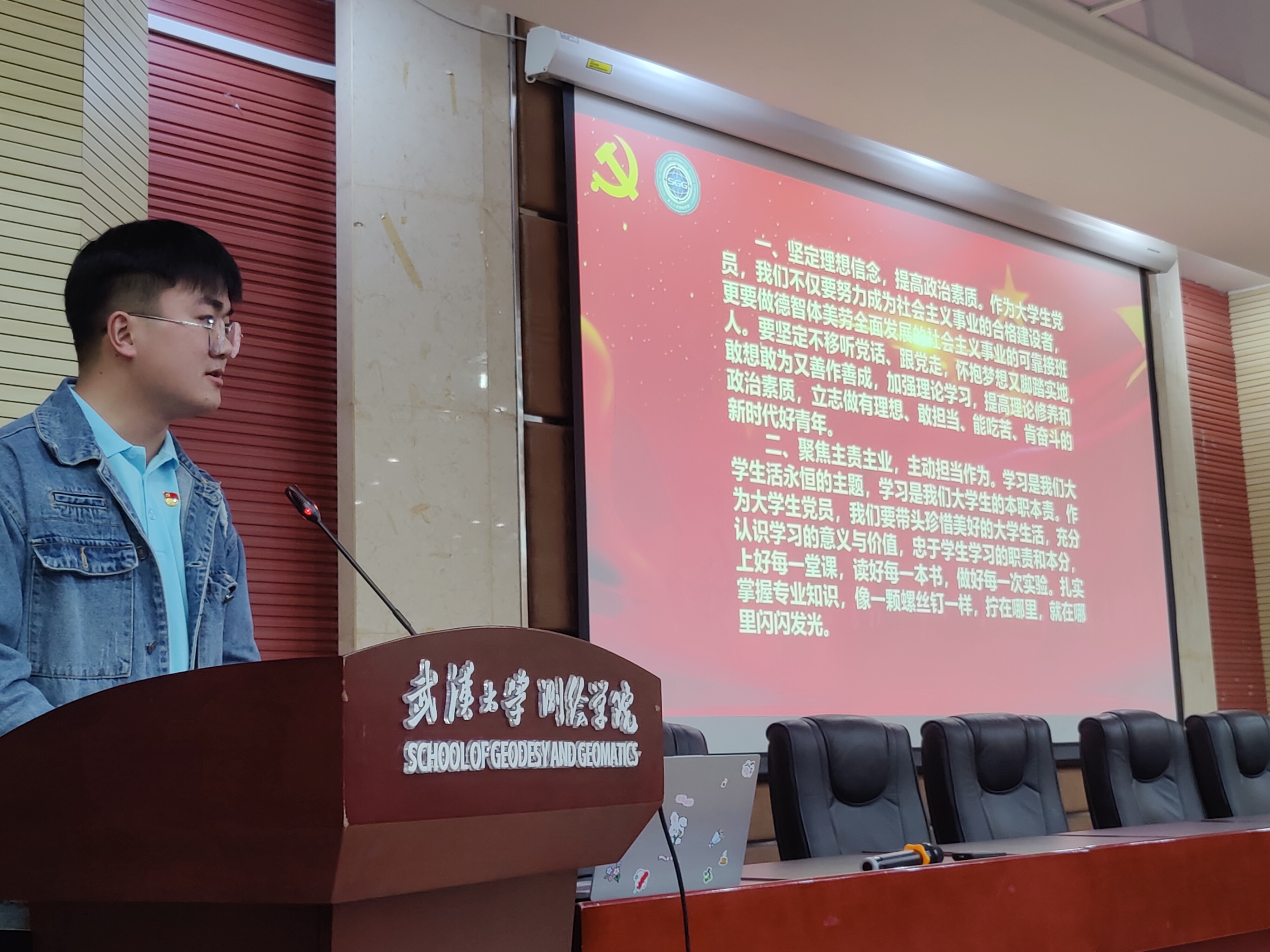 随后,本科生党员代表杨春豪宣读本科生党总支发布的学生党员模范倡议书,倡议大家一要坚定理想信念,提高政治素质;二要聚焦主责主业,主动担当作为;三要强化宗旨意识,争做先锋楷模,立志做有理想、敢担当、能吃苦、肯奋斗的新时代好青年,真正做到无愧于共产党员的光荣称号。