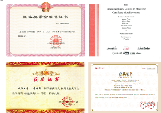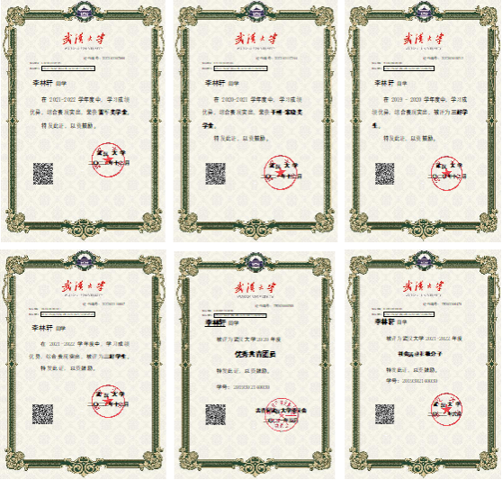 1.雷军奖学金、于刚·宋晓奖学金、国家奖学金、武汉大学甲等奖学金(3次)
