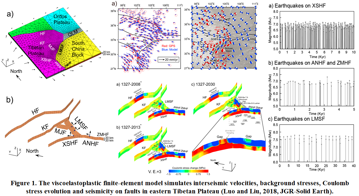 • Gang Luo*, Mian Liu, 2018, Stressing rates and seismicity on the major faults in eastern Tibetan Plateau, Journal of Geophysical Research-Solid Earth, 123, p. 10968-10986, https://doi.org/10.1029/2018JB015532.