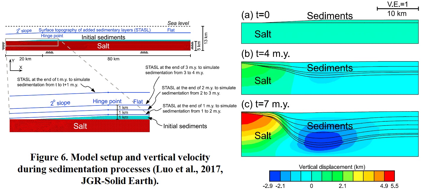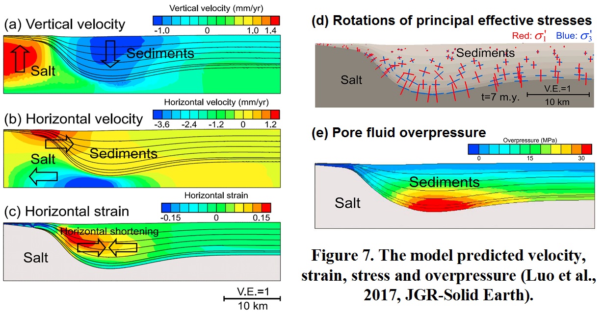 • 使用数值模拟的方法来理解盐体系统的变形、应力和孔隙流体压力,以及钻井稳定性,从而理解沉积盆地演化的基本物理过程,为盐体周围的石油勘探、钻井开发等等提供支持。